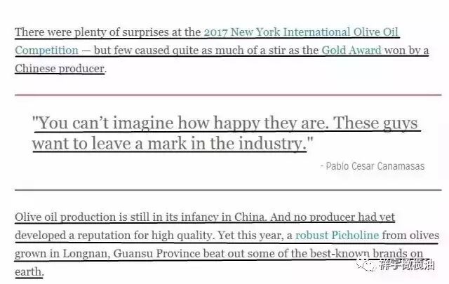 譯文:在2017屆紐約國(guó)際橄欖油大賽上驚喜不斷,但卻未曾出現(xiàn)過中國(guó)原產(chǎn)的橄欖油獲得金獎(jiǎng)這樣的轟動(dòng)。